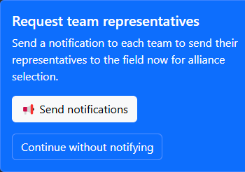 Tap the “Send notifications” action in order to immediately send notifications to all teams letting them you are ready for them at the field. Aim to send this notification ~15 minutes before alliance selection is scheduled to start, around when the last match is almost on field.