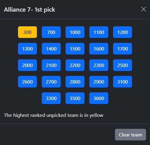 The highest ranked unpicked team in the modal will be highlighted in yellow.