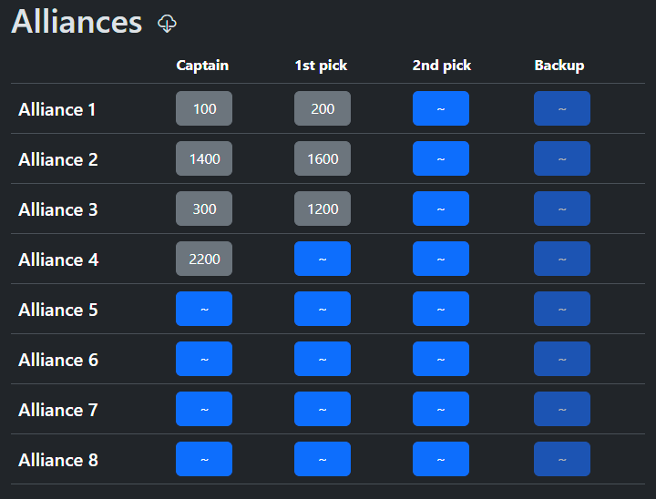 If alliance selection is already complete, alliances can be imported from the API. Tap the “import from cloud” icon on the alliances page. This import may also happen automatically if you have not yet started entering alliances.