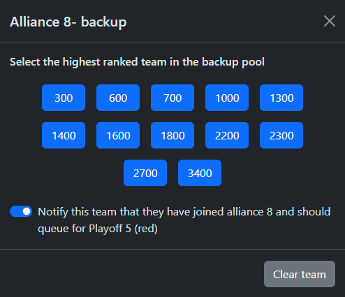 Add a backup teams to their assigned playoff alliance when they get confirmed by the head ref. This will notify the team that they have joined the alliance and enable them to receive queuing notifications during the rest of the playoffs.