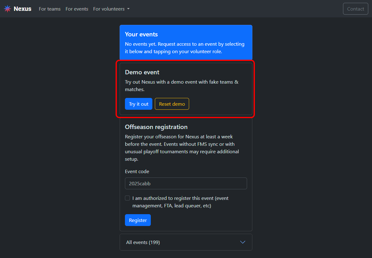 You can create a demo event in Nexus to experience the real system end-to-end before you use it at a real event.