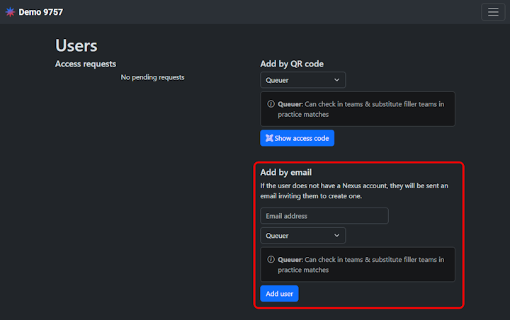 Users can be added by entering their email address on the users page and selecting the role you would like to grant them.