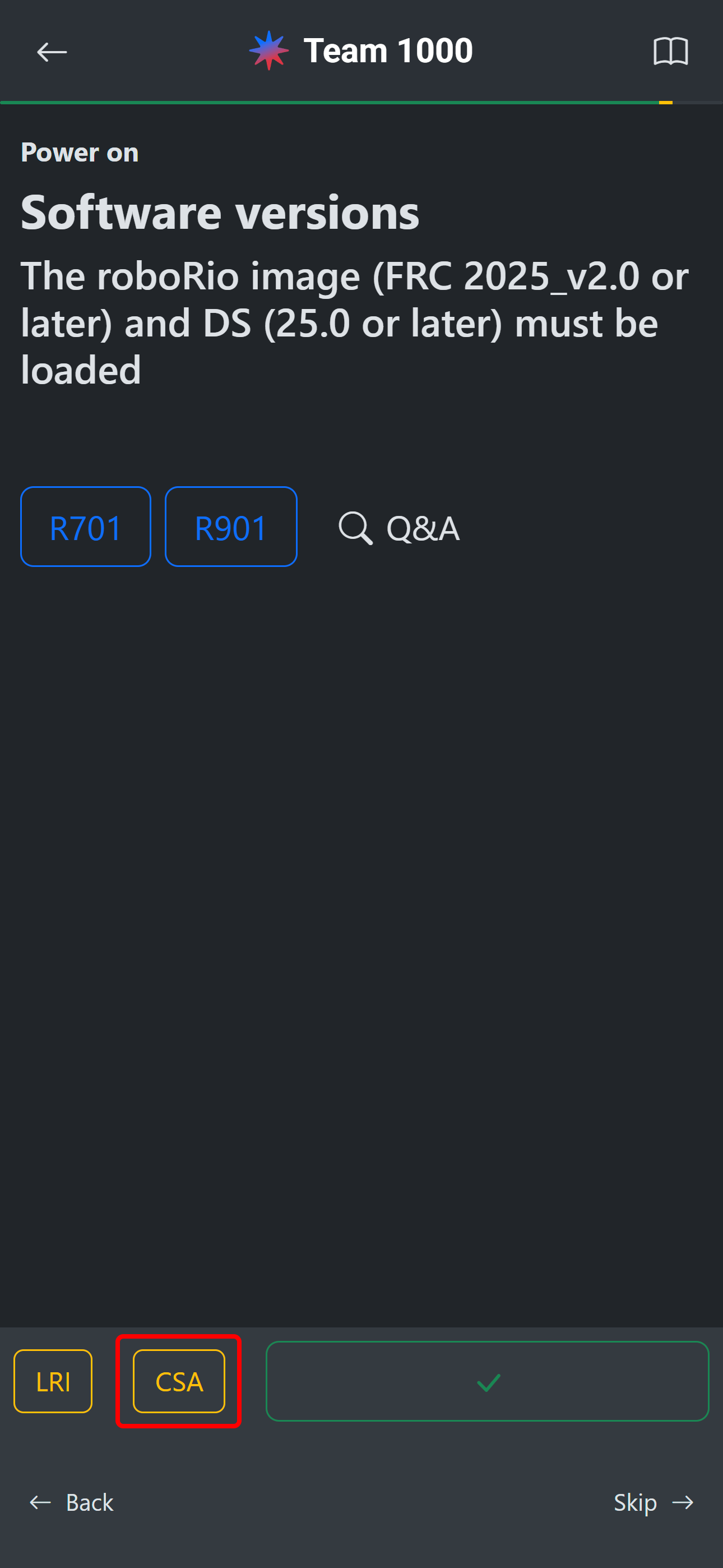 If the event has configured a CSA Slack channel, then the “CSA” option will be shown for the “Software versions” inspection item. If the team has out of date software and needs assistance updating it, tap the “CSA” button and a CSA will come by as soon as they are able.