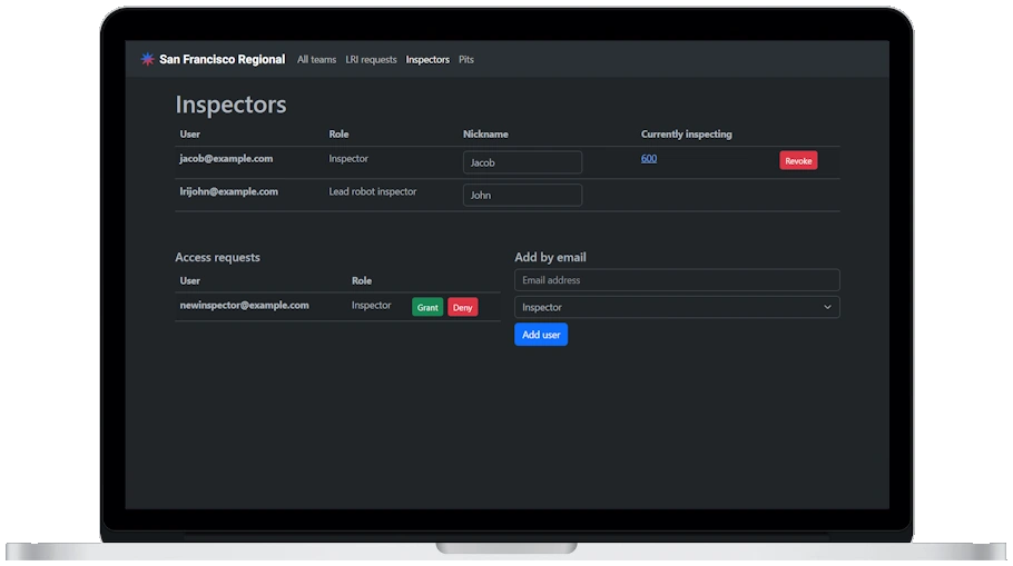 Tap the “Inspectors” option in the volunteer menu. Users with the Lead robot inspector role can grant volunteers access. Users with the Inspector role can update nicknames.