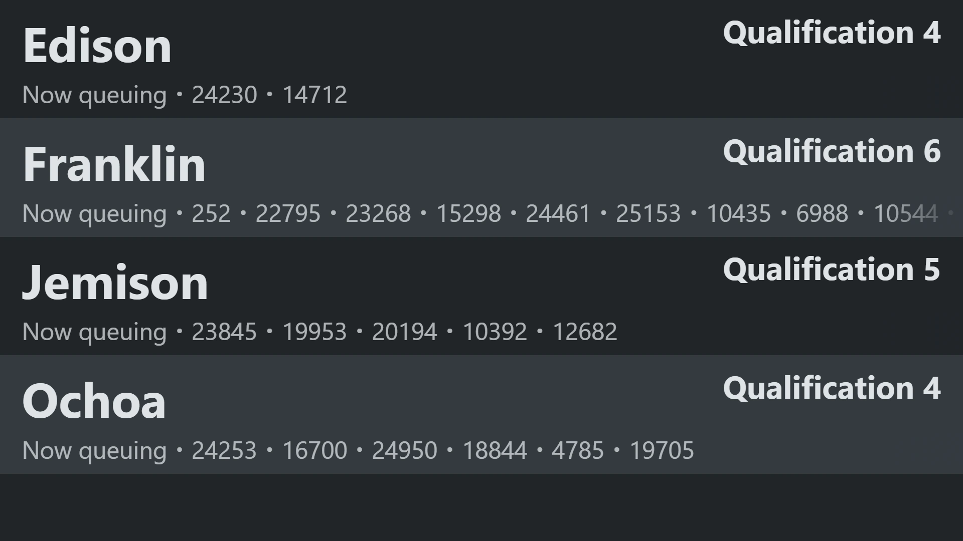 The combined queuing status display will show the queuing status for all divisions on a single screen. Teams that are queuing but not yet checked in will also be displayed for each division.