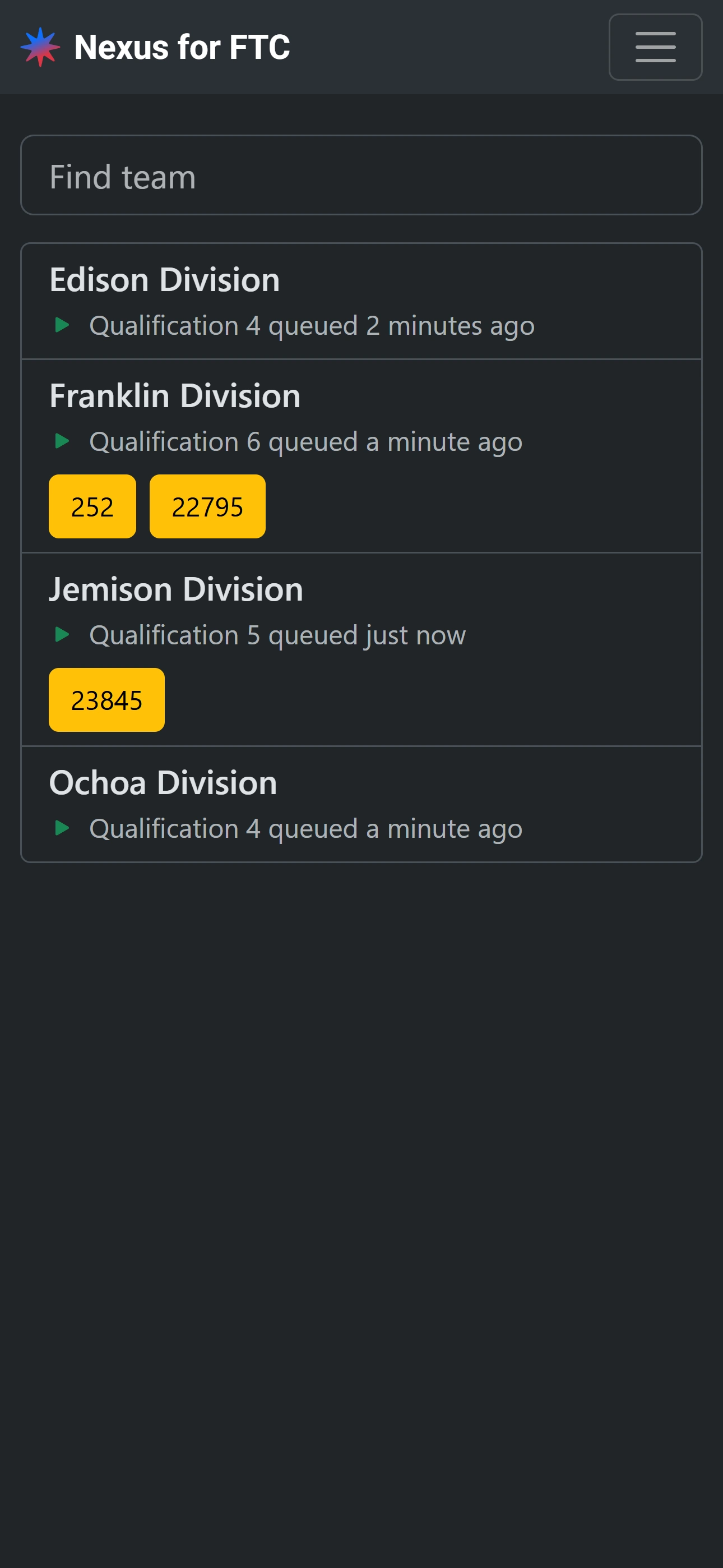For events with 4 or more divisions that culminate in an inter-division playoff tournament, Nexus supports queuing inter-division playoff matches. Once a division’s winning alliance is entered into Nexus by the lead queuer, the alliance will automatically be added to the championship playoffs event. Notification preferences will be copied automatically, so teams do not need to sign up for notifications again. If they need to update their notifications, they can scan the Nexus code they received for their division.