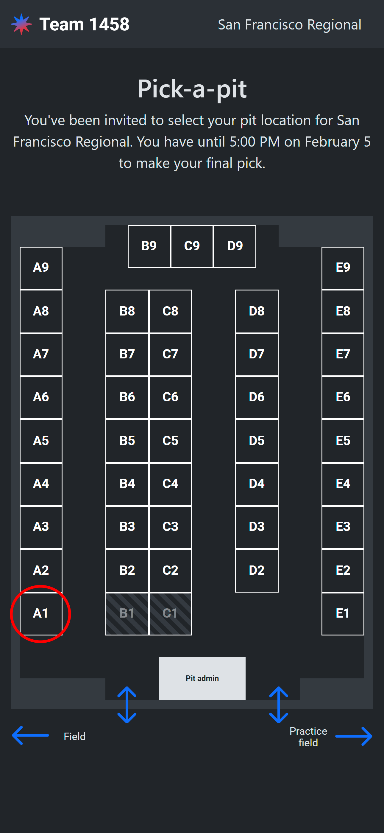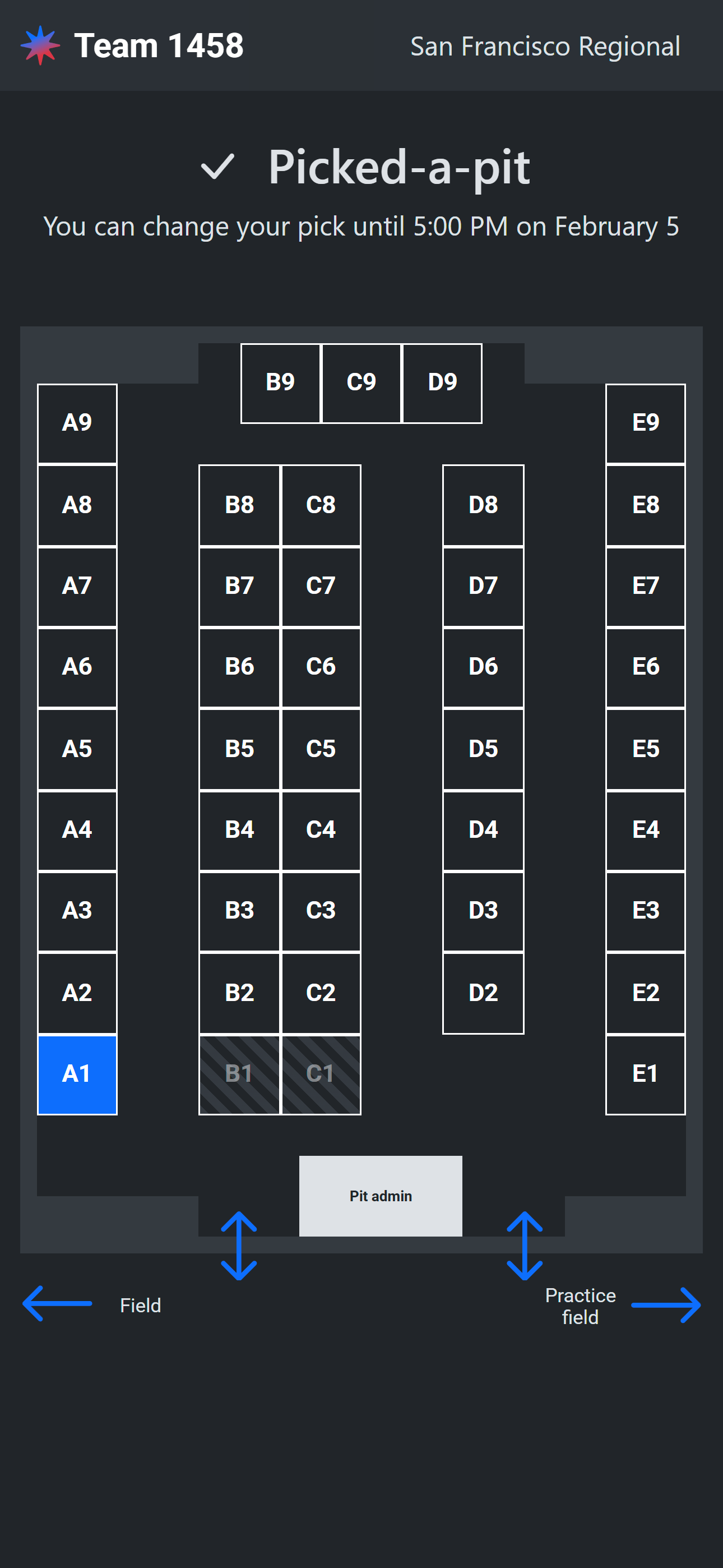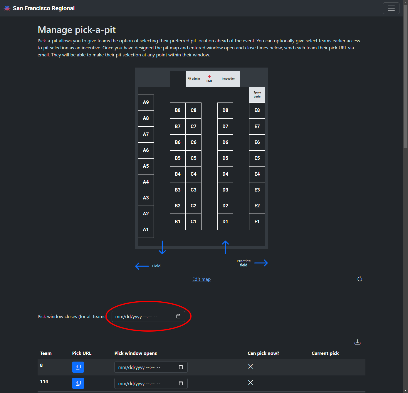 When a team opens their pick URL, they will be shown the pit map with current availability annotated. If it is currently after their window open time and before the window close time, they will be able to select a pit from the available options. They can change their selection any number of times up until their window close time.