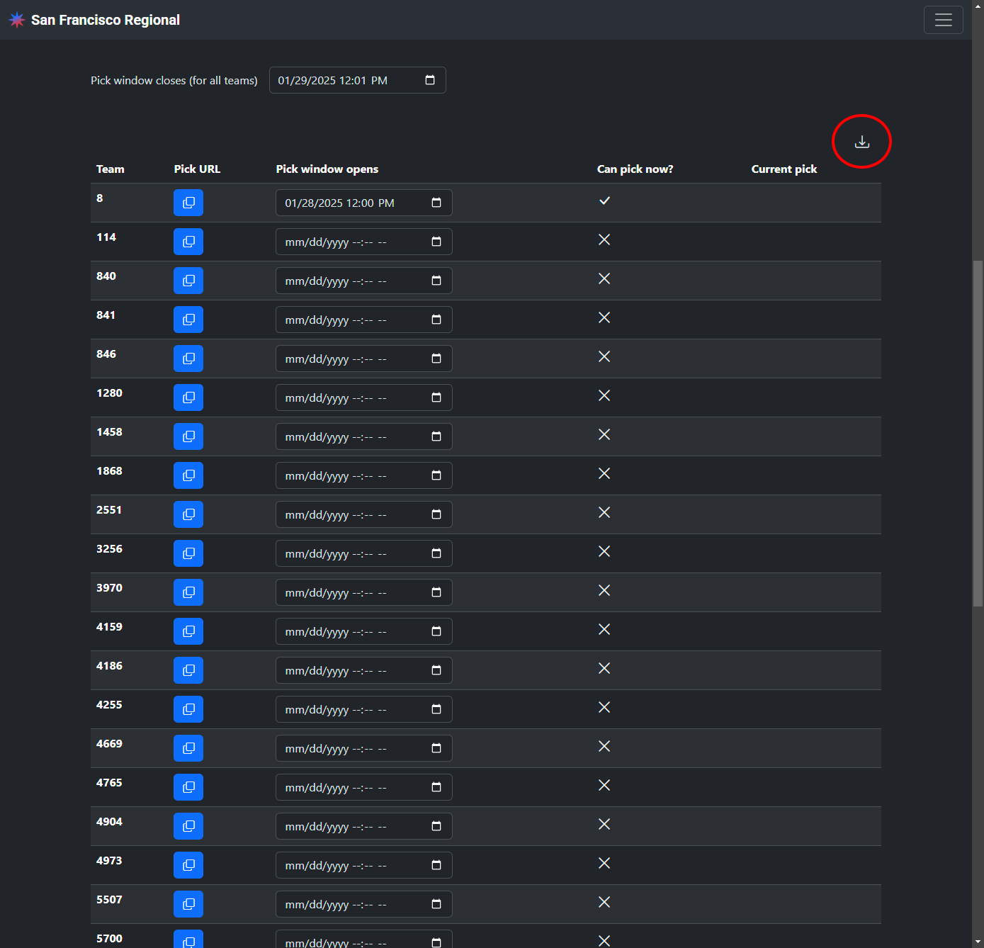 Set the close time to set a deadline for all teams to make their final pick. After this time, you can export all picks and teams will no longer be able to make any changes.