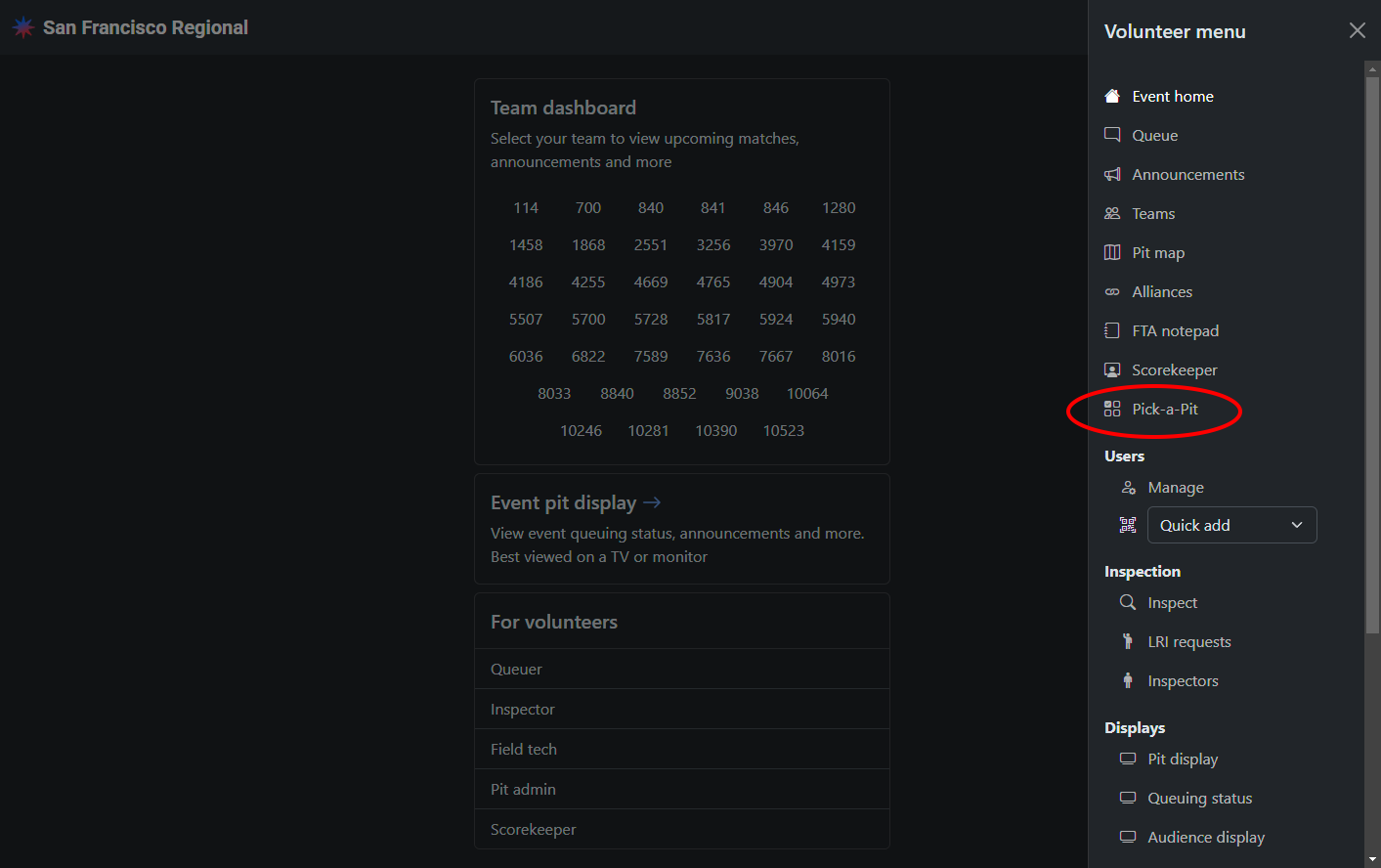 To manage Pick-a-Pit for your event, you will need to be granted the Pick-a-pit manager role. Email contact@frc.nexus to receive the necessary access.