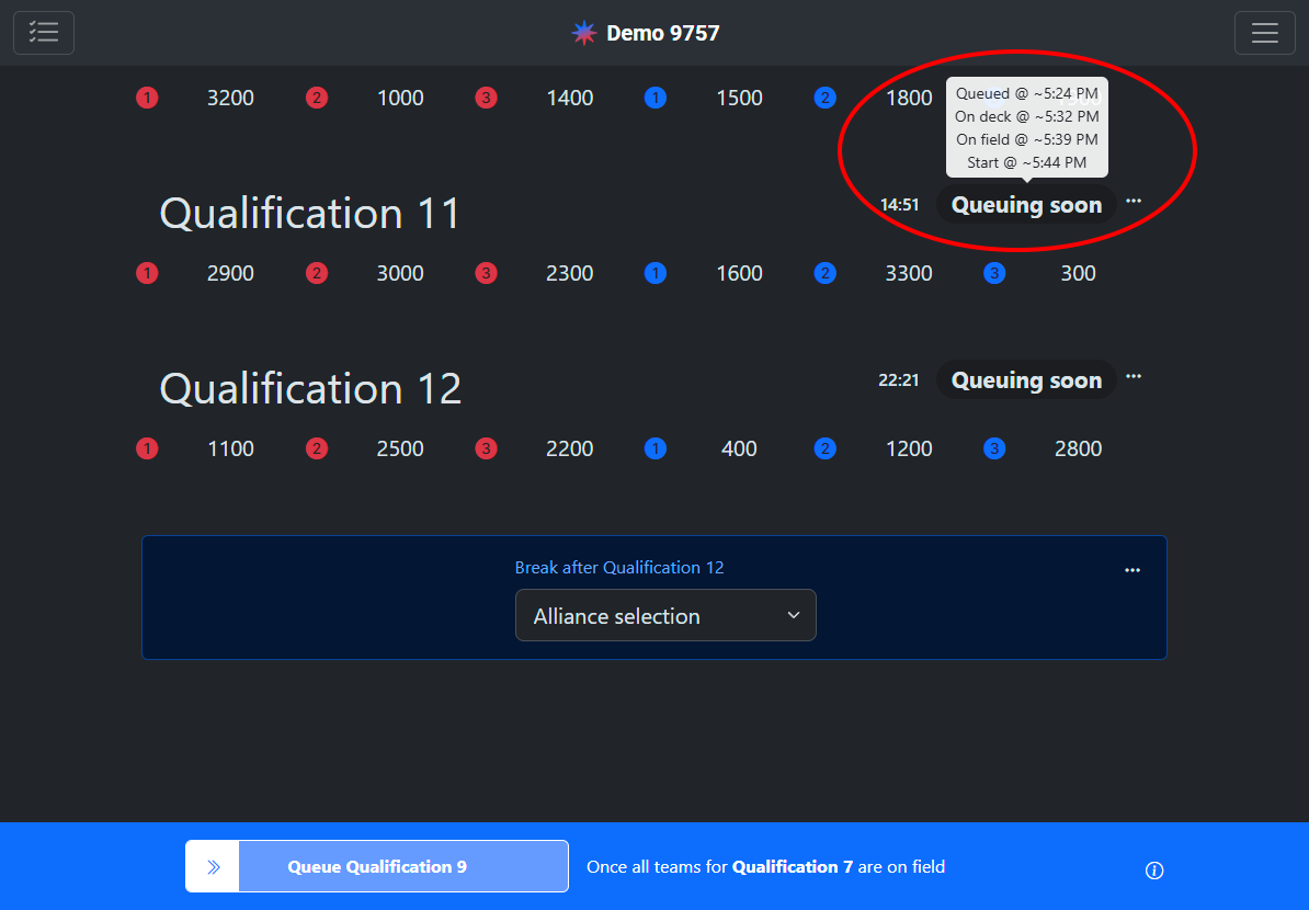 At most events, the first match starts as soon after opening ceremonies as possible. Queue the first two matches about 15 minutes before the start of opening ceremonies to provide teams with additional advance warning. These matches are automatically marked for teams as “queue before opening ceremonies” so they can prepare for this in advance.