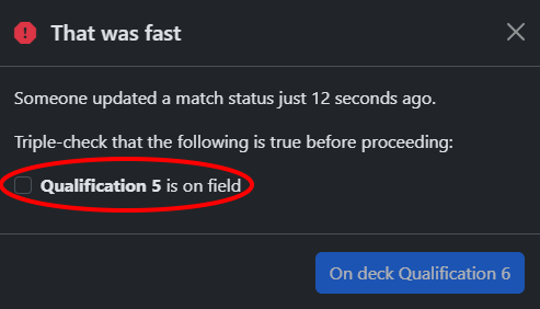 To prevent accidental double-queuing, you will be warned if you attempt to queue within 4 minutes after a match status was previously updated. Whenever you see this warning, triple-check which match is currently on the field and only proceed when you are sure the condition is met.
