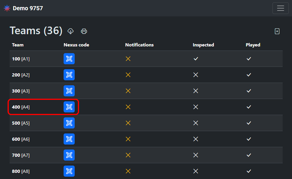 If a team loses their handout or never got one, you can pull up their Nexus code on the “Teams” page. Tap the button in the “Nexus code” column next to their team number.